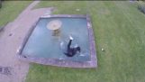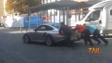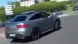 Bir adam BMW X5'iyle hızlanmak ve sürüklenmede bir gösteri yapmak istedi. Ağır araba kaldırıma çarptı ve arka sağ tekerleğini kırdı.