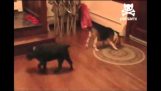 Bir kedi, bir bebeğin dikkatini çekmemek için hareketsiz kalır.