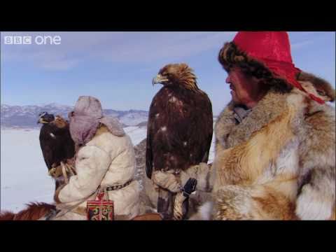 Eğitimli bir chryaseto ile bir tilki kovalayan iki Kazaklar, Altay Dağları Moğolistan.