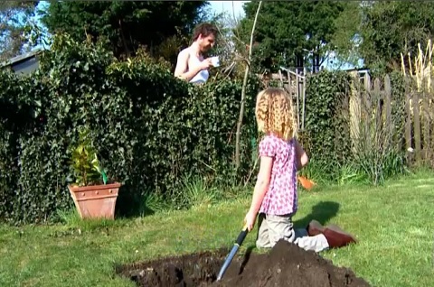 Küçük yabancı chrysopsaro ölüleri gömmek istiyor.. Ama neden Bahçe büyük bir çukur kazmak;