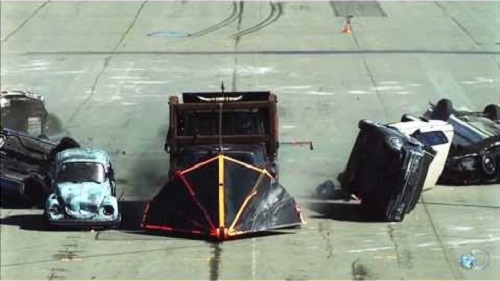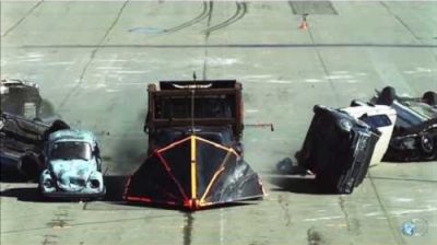 Aracın trafiğe karşı, Mythbusters son bir yayın mizahi tarzda inşa. Burada, ağır çekimde 16 arabanın yolunu döşediğini görüyoruz..