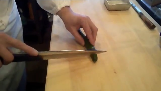 Japon Şef bizi ne kadar sanatsal bir salatalık yemeği 'morokyuu' oluşturmak için gösterir.