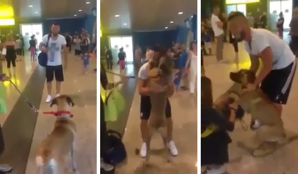 Güzel bir anı yerde bir köpek enthusiastically hırlıyor, altı aylık yurtdışı seyahatinden dönen havaalanında patronuyla tanışırken.