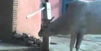 Onun susuzluğunu gidermek için su pompası kullanan bir inek