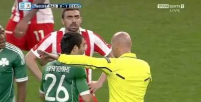 Olimpiyat futbolcusu Hüseyin Maniatis paha biçilmez yüzü, Panathinaikos Olympiakos derbisinde hakemin düdüğünden sonra.