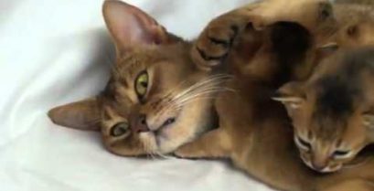 Bir kedi yavruları ile çok hassas bir anda Abyssinia