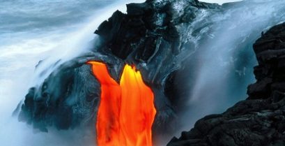 Kīlauea volkan Hawaii mürekkebin lavların deniz sular altında. Altta iki öğe arasında büyük bir savaş raging.
