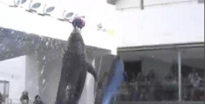Akvaryum kasaba Sasebo, Japonya, iki dolphins topu havada geçen yapmak öğrendim!