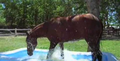 Bir atın etrafında bir çocuk havuzu su sıçramalarına ve sonra içinde yatıyor.