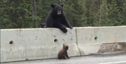 Anne ayı uzakta tehlikeli otoyol ve koruyucu barikatlar üzerinde küçük bir oyuncak ayı çeker. British Colombia, Kanada.