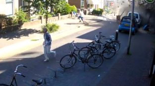 Binaların arka taraftan çekim, Bir kez Hollandalı Alphen aan den Rijn şehirde büyük bir vinç daraltır. Şüphelenmeyen yayalar ve bisikletliler, yollarına neyin geldiğini anlamadan paniğe kapılır. [...]