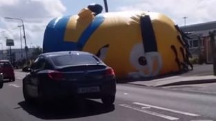 Bir sergide dekorasyon olarak kullanılan 12 metre yüksekliğinde dev bir şişme Minion, Rüzgar tarafından uzak yıkanmış ve neden kaos bir sokakta Dublin, İrlanda. Onun olduğu ipler [...]