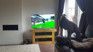 Bir köpek televizyon izleme, O futbol maçında Köşe vuruşunu topu kimin yaptığını bulmak için arıyor.