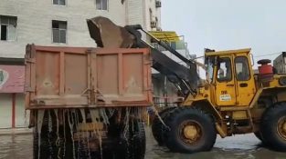 Irak'ın Bağdat İki belediye işçileri, Onlar bir buldozer ve bir damperli kamyon kullanarak sular altında yol su çekmek için çalışıyoruz. Elbette, çabaları boşuna...