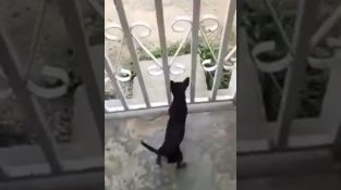 Küçük bir köpek, bir kapının parmaklıklarının arkasına girer girmez çok vahşidir..