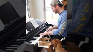 Bir köpek, sahibinin piyanoda Rachmaninov'un bir parçasını çalmasına yardım ediyor.