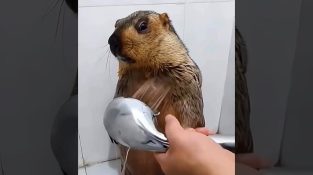 Bir dağ sıçanı çok hareketsiz oturuyor, birisi ona banyo yaptırırken.