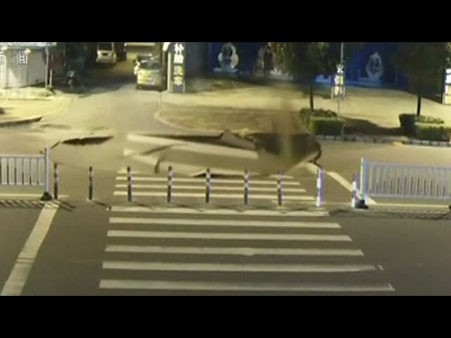 місто Бейхай в Китаї, людина на скутері абсорбується зі свого мобільного телефону, Він побачив освіту раковини в середині дороги. Людина впала у величезну діру і відбувся незначними травмами.