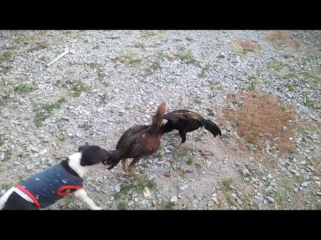 На фермі в Таїланді Chaiyaphum регіоні, собака намагається розділити два півнів, які сварка.