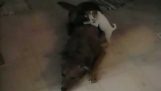 У будинку в Окінаві, Японія, німецька вівчарка хоче сидіти на ліжку, але верх кішка. Чи буде ігнорувати його нарочито, і буде сидіти на ньому.