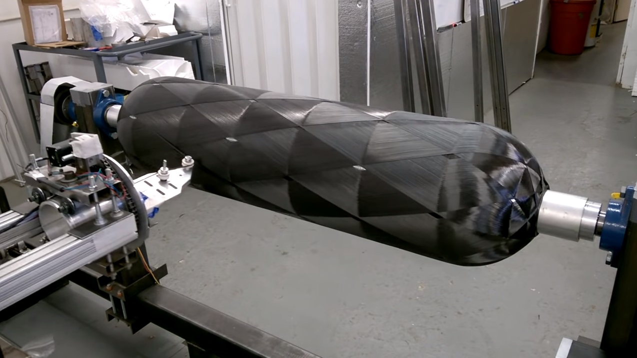 Компанія межглазничного Systems в США Каліфорнія, показана конструкція паливного бака для установки в космічній ракеті. Бак поступово покривається товстим шаром з вуглецевого волокна.