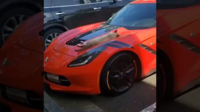 Бездомна кішка, насолоджуючись її спати на теплому капоті Corvette, коли власник приходить будити.