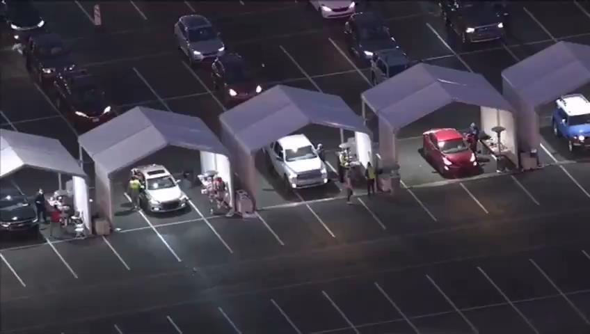 На стоянці стадіону Державного ферми в Арізоні, США, Сотні водіїв стоять у черзі, щоб зробити щеплення проти Covid-19. Штат Арізона організував щеплення таким чином, протягом дня робити щеплення якомога більшій кількості громадян.