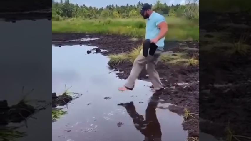Чоловік намагається перетнути болото, і знімає взуття, щоб не забруднитись. Зрештою, глибина води виявилася не такою, як він очікував.