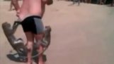 Чоловік хотів витягнути селфі з пеліканом, Тож він підійшов до нього своїм мобільним телефоном. Пелікан стояв як статуя, але раптом він схопив чоловіка головою дзьобуванням. Дуже особливий селфі.