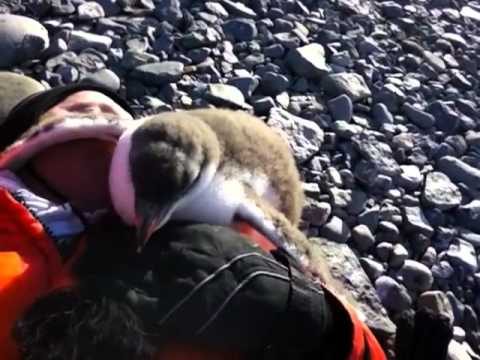 Малий пінгвін зустрічає чоловіка в перший раз.
