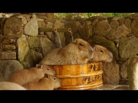 Капибара (ydrochoiroi) у Зоологічний парк Нагасакі в Японії, Насолоджуйтесь гарячу ванну. На відміну від інших парків зоопарк, у певних гостей дозволяється безпечно взаємодіяти з тваринами.