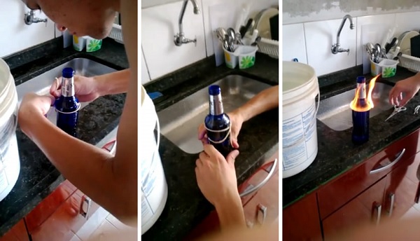 Простий спосіб перетворити пляшку пива в скло. Змочити рядок з маслом або алкоголю і краватку навколо пляшку пива, до того, що ми хочемо, щоб скоротити наші скла. Ми ставимо вогню в рядок з запальничка і набір сторону, поки повністю не стерти. Відразу ж після того, як ви помістіть пляшку всередині в холодну воду і скло знизить замість рядка. Нарешті руб краях скла на наждачним папером.