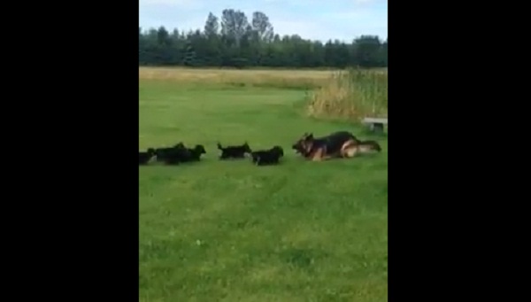 Німецька вівчарка грає з малого в траві. Мама весело бігає навколо своїх 8 цуценят, намагаючись зловити її.