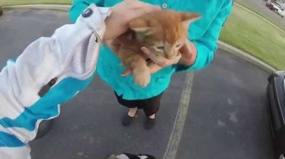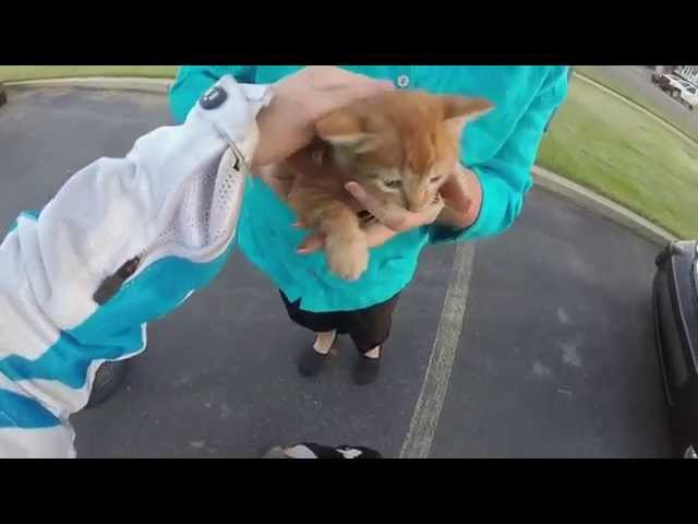 Як терпляче чекати на червоне світло промінь, за motosikletistria бачить дрібниця рух на дорозі. Вона має кошеня ходить між коліс автомобілів і ніхто, здається, помітив. Жінка зійти з велосипеда і приймати на рятувальної. Після того, як ви покладете дрібних тварин на спині повернувся додому і пішов до ветеринара, де було встановлено, що є абсолютно здоровим.