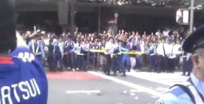 Японці cheering exalla на дорозі, як їх команда виграла Данії матч Кубка світу. Але коли ліхтар світиться зелений для легкових автомобілів, люб'язно рухатися по тротуарах.