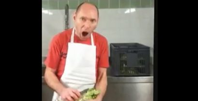 Клерк в Нанті у Франції у ресторані лякає вище Кука, хто реагує кожного разу з тією ж, дуже цікавий спосіб.