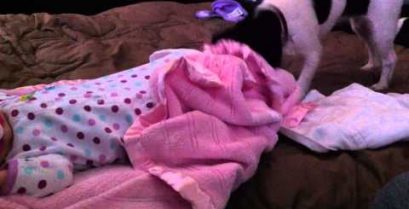 Собака доглядає за 10-місячною дитиною, покриття з ковдрою.