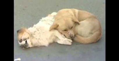 Собака в Китаї залишається лояльним до свого друга, лежить мертвим в вулиці на проходження автомобілі.