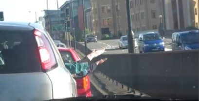 Два драйвера у Великобританії грають рок папір ножиці своїми руками з вікна, очікування лущитися від перевезення джем.