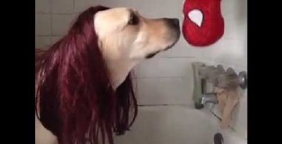 Лабрадор піт і його бос, зіграйте знамениту сцену з поцілунком під дощем з фільму «Людина-павук» 2002 року.