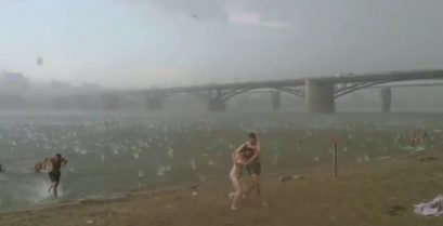Запеклі HailStorm спалахує протягом декількох секунд до пляжу в Новосибірську, у Росії. Побачити, як велика град, яка починає падати до 0:30.