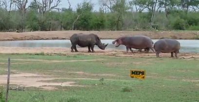 Rhino напади молода Бегемот, але потім інша Бегемот розташований поблизу довгими диски від стада. Інцидент стався в Дике життя Hlane Національний парк, Свазіленд.