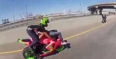 Чоловік і жінка робить вражаючі акробатичні на мотоциклі.