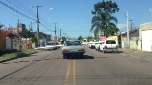 Люди похилого віку використовує його машину нести ПВХ труб декількох метрів у довжину, на вулицях Курітібі в Бразилії. З трубою між передньою Windows, попадання декількох припаркованих автомобілів. [...]