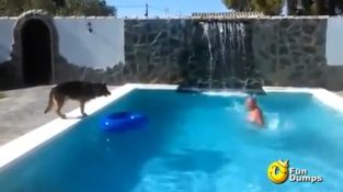 Власник Німецька вівчарка прикидаються він не можуть плавати і потонув у басейні. Собака, просто дивлячись на свого боса, щоб небезпеки, увірвався воду, щоб допомогти йому.