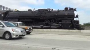 Локомотив Santa Fe 3751 1927 року, Переїзд з Лос-Анджелеса в Сан-Бернардіно, штат Каліфорнія, де я виставлені на огляд громадськості. Лінії залізниці є дуже близько до автомагістралі, і [...]