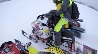 Під час поїздки в засніжені гори в Швеції, людина буде змінюватися приховані у зворотному швидкості в його друг снігохід.