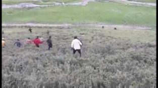 Людина переслідуваний ведмедя в долині в Тибеті.