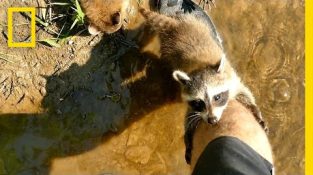 Спостерігати за три чарівні і грайливий дитина єноти подружитеся людина на риболовлю.