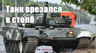 На слизькому асфальті танк занесло при спробі знизити швидкість і врізався в стовп. Збиток був не тільки до стовпа і тротуар, але до самої бойовій техніці.